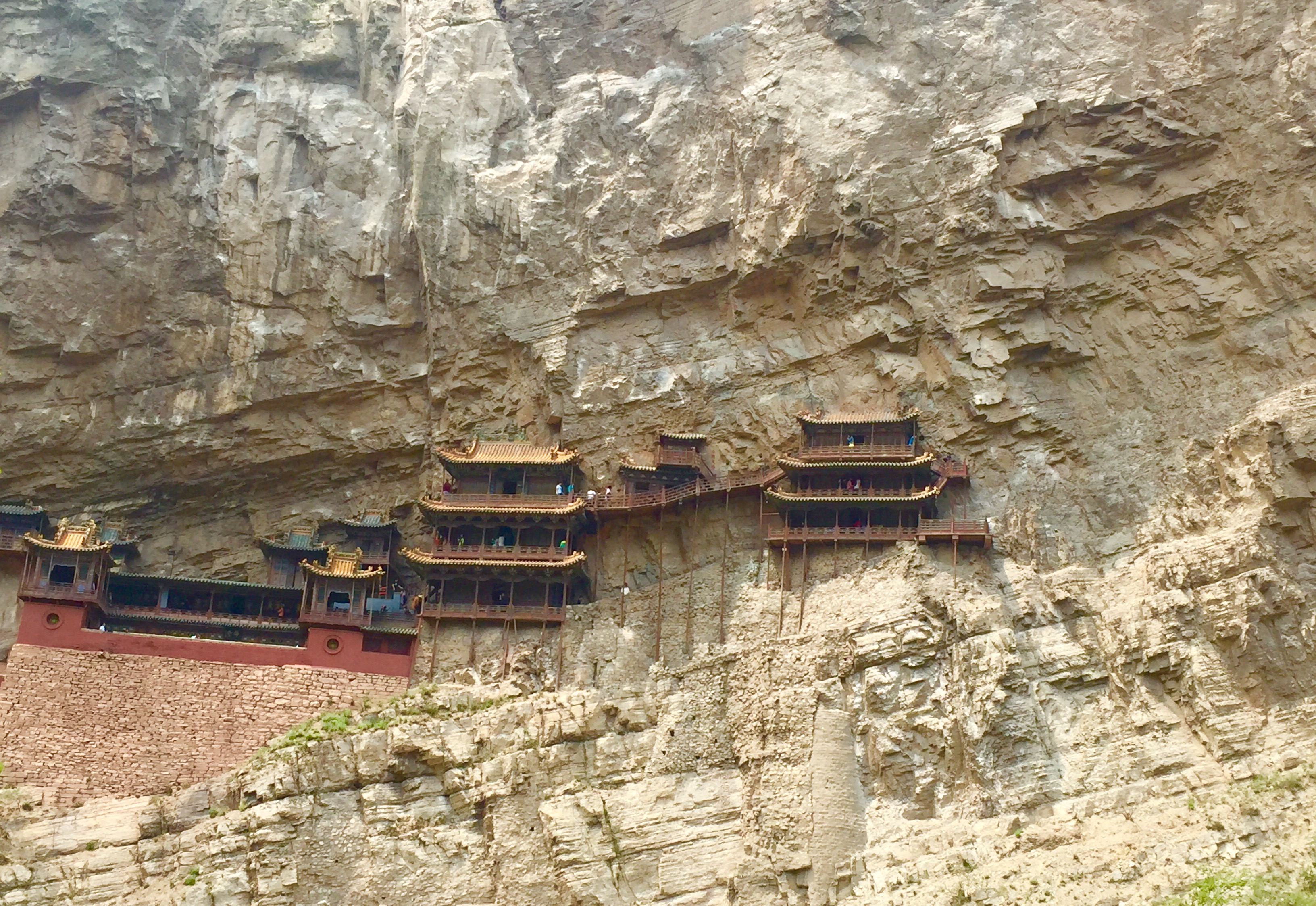 我们本次游学的最后一站为悬空寺,明王湛初有诗云:“谁凿高山石,凌虚构梵宫。蜃楼疑海上,鸟道没云中”,素有“悬空寺,半天高,三根马尾空中吊”的俚语,以如临深渊的险峻而著称。建成于1400年前北魏后期,是中国仅存的佛、道、儒三教合一的独特寺庙。 也因为它的高险,老师特意叮嘱恐高的同学注意安全,靠里侧走。北魏天兴元年(公元398年),北魏建都平城(今大同市),北魏天师道长寇谦之(公元365-448)仙逝前留下遗训:要建一座空中寺院,以达“上延霄客,下绝嚣浮”。之后天师弟子们多方筹资,精心选址设计,悬空寺于北魏太和十五年(公元491年)建成。唐开元二十三年(公元735年),李白游览悬空寺后,在岩壁上书写了“壮观”二字。悬空寺现存建筑是明清两代修缮的遗物。参观完毕,我们坐上学校大巴回到学校。