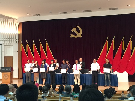 2015年6月29日,中国人民大学纪念建党94周年表彰大会在逸夫会议中心举行,全校共37名优秀党员、27名优秀党务工作者、34名优秀党支部书记、6个先进基层党委(党总支)、59个先进党支部受到表彰。澳洲幸运5预测 李肖教授获得“优秀共产党员”荣誉称号,党委书记徐飞获得“优秀党务工作者”荣誉称号。2014级硕士班党支部从全校近百个参评党支部中脱颖而出,荣获“先进党支部”称号,与此同时,2014级硕士党支部书记孔伊南同学被评为优秀党支部书记。