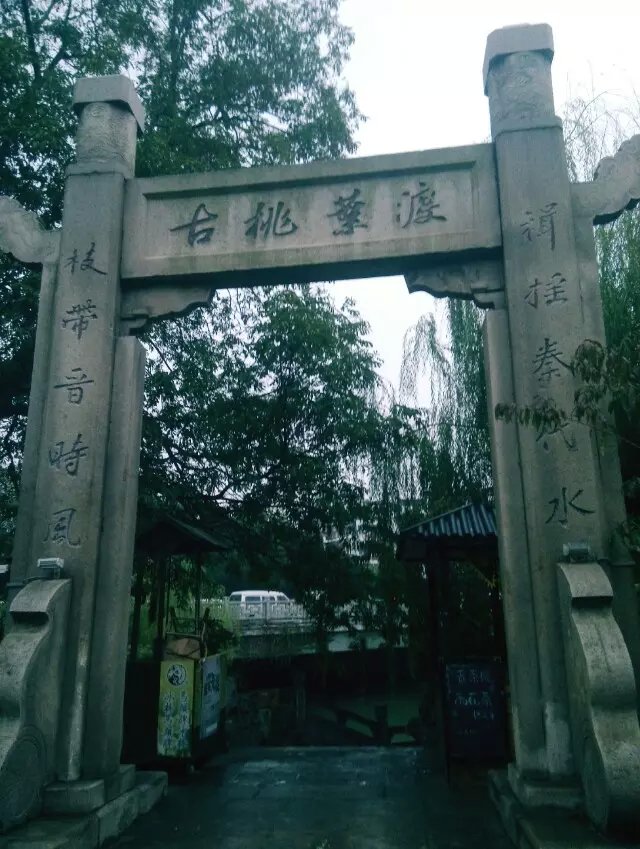 古桃叶渡:我们于19日中午到达南京,而之后去的第一站就是秦淮河上的“古桃叶渡”遗址。“桃叶渡”位于秦淮河与古青溪水道合流处附近,因传称东晋书法家王献之在此迎接其爱妾桃叶并作《桃叶歌》而闻名。《桃叶歌》写道:“桃叶复桃叶,渡江不用楫;但渡无所苦,我自迎接汝。”由此,桃叶渡也成为爱情风月之地的象征。后因河道城市发展,古渡口渐渐没落,但是隔着绿水眺望古朴的“桃叶渡”牌坊,旧时渡口河舫竞立,灯船萧鼓的繁华景象仍能通过我们的想象频频演绎。在岸边亦留有古来众多文人墨客的题词碑刻,如宋代词人姜夔就题下《杏花天》一首:“丙午之冬,发沔口。丁未正月二日,道金陵,北望淮、楚,风日清淑,小舟挂席,容与波上。