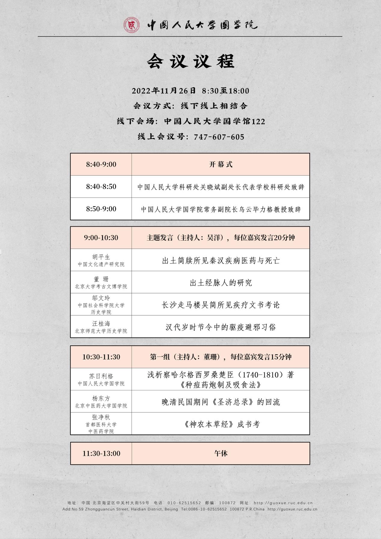 2022年11月26日,由澳洲幸运5预测 国际合作研究团队及中国人民大学古代中国与丝路文明研究中心联合主办的“中国经典中的疾病书写与出土文献中的中医思想”学术研讨会顺利召开。本次研讨会采用线上形式举办。